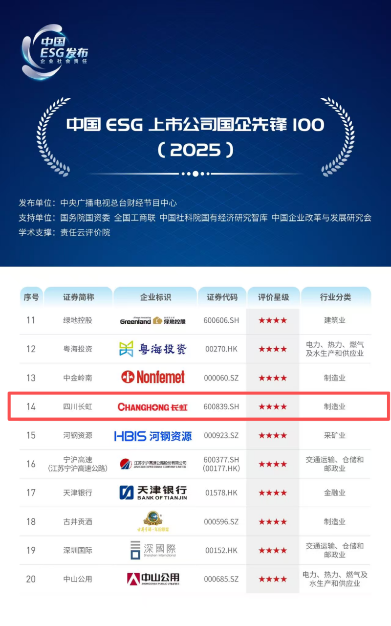 近日,“ESG中国·创新年会(2025)暨首届ESG国际博览会”在京成功召开。在主论坛活动上,中央广播电视总台财经节目中心发布《2025年度ESG行动报告》,并公布“中国ESG上市公司先锋100(2025)”“中国ESG上市公司央企先锋100(2025)”等权威榜单。四川长虹凭借在ESG领域的卓越表现,入选“中国ESG上市公司先锋100(2025)”“中国ESG上市公司国企先锋100(2025)”榜单。