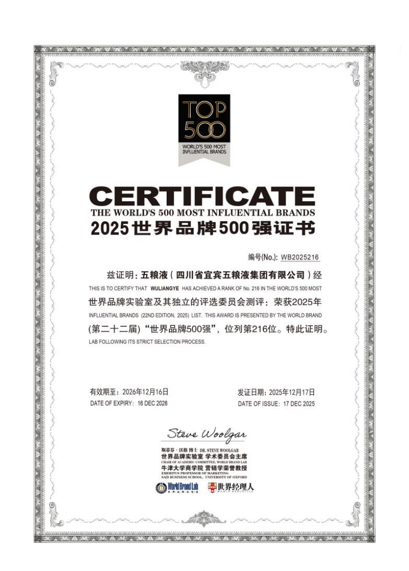 12月17日,由世界品牌实验室(World Brand Lab)发布的2025年度(第二十二届)《世界品牌500强》排行榜揭晓,五粮液连续9年上榜,位列216位,较去年上升3位,品牌排名增幅位居烈酒行业第一。