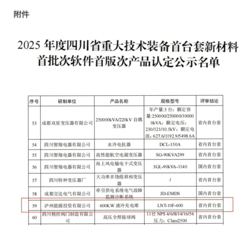 近日,四川省经济和信息化厅公示2025年度四川省重大技术装备首台套新材料产品名单,高新控股旗下泸州能投自主研发的600kW液冷分体式充电堆泸州能投LNT-10F-600成功入选“省内首台套”。此次省级权威认定,标志着泸州能投在大功率充电装备领域的自主研发能力跻身省内领先水平,填补了四川省兆瓦级液冷超充装备领域的技术空白。