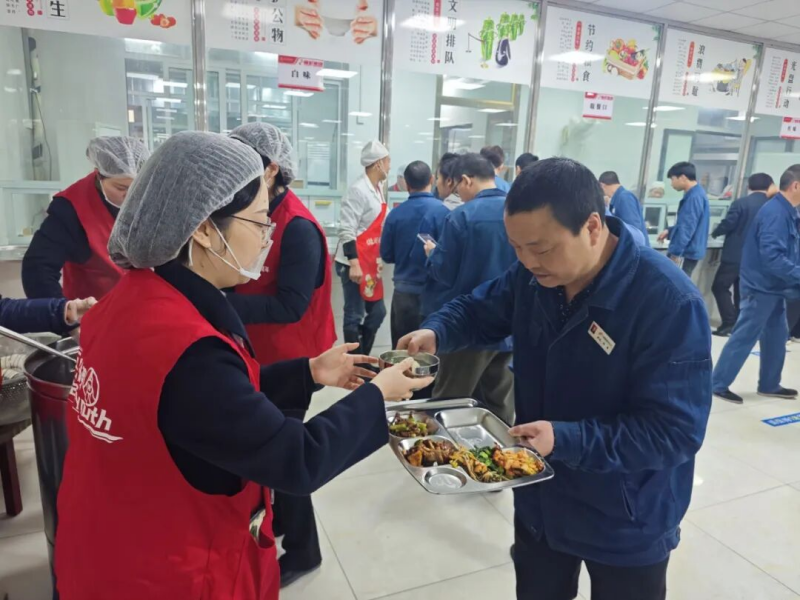 在食堂取餐区域,青年志愿者们有序盛汤、分餐,将一碗碗寓意团圆美满的豆腐丸子汤送到职工手中,传递节日的关怀与祝福,以实际行动践行雷锋精神,为公司高质量发展注入青春暖流。