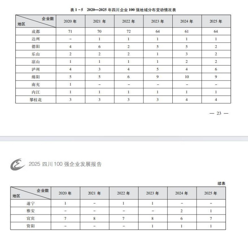 地域之间的竞争同样激烈。从地域分布来看,100强企业地域分布主要集中在成都,2021年至2025年,成都地区上榜企业数量分别为70家、72家、64家、61家、64家。