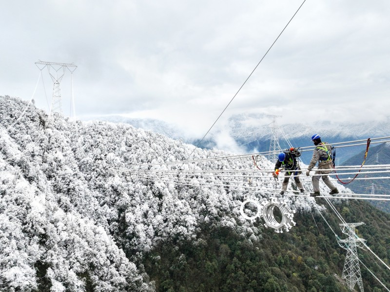 金上—湖北±800千伏特高压直流输电工程在雅安市二郎山施工场景。