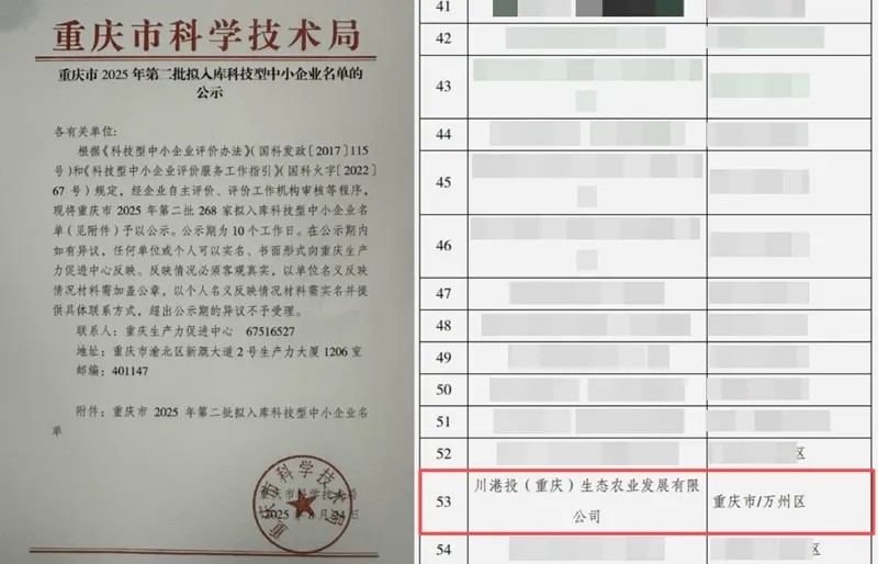 省港投集团:重庆生态农业公司成功入库“国家级科技型中小企业”“重庆市科技型企业”