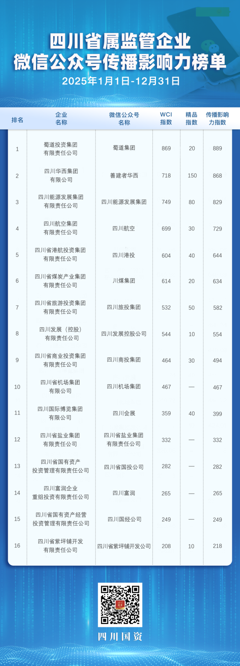为充分发挥矩阵力量,凝聚联动宣传合力,进一步提升四川省国资系统微信公众号传播力和影响力,省国资委在四川省属监管企业微信公众号开展传播影响力综合评价,并发布“四川省属监管企业微信公众号传播影响力榜单”。本期发布2025年度榜单。
