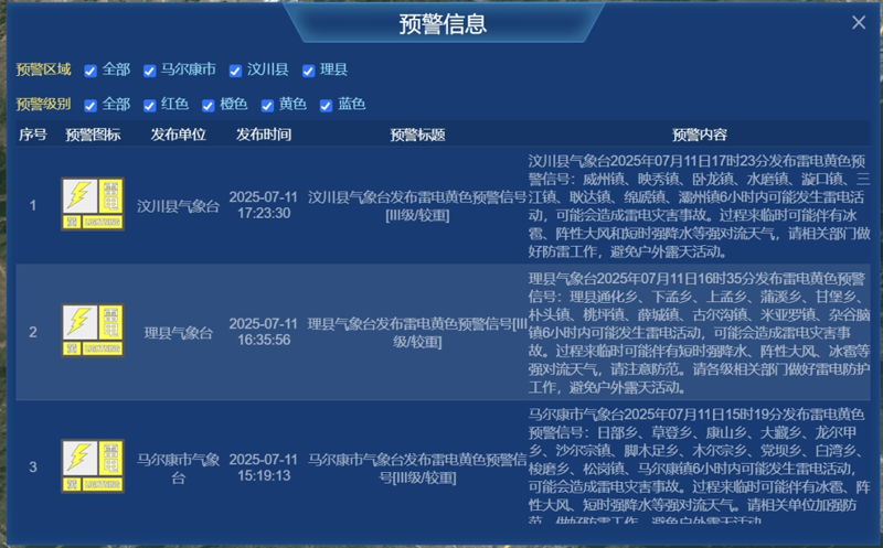 以2025年7月11日为例,汶川县气象台发布“雷电黄色预警”后,平台立即同步预警信息,明确“威州镇、映秀镇等区域6小时内可能伴随冰雹、短时强降水”,联勤单位迅速组织户外作业人员撤离,避免了安全风险。