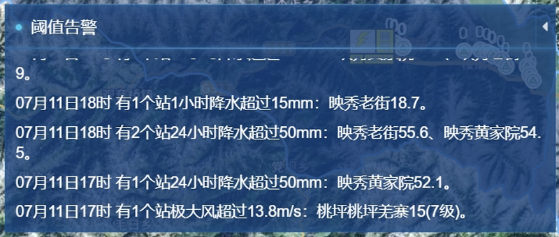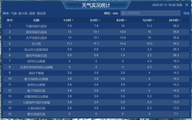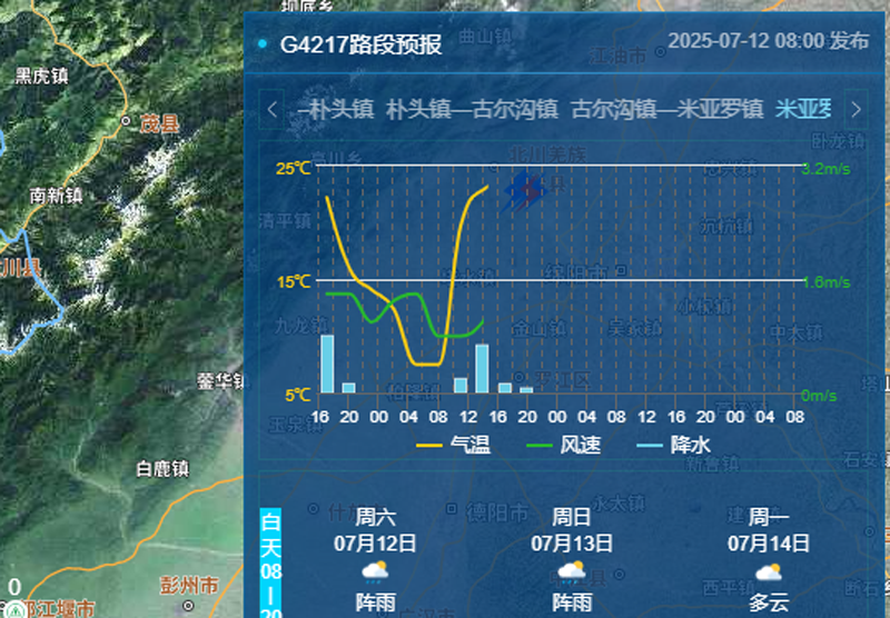例如,平台可实时更新各路段1小时、3小时、24小时降水量,甚至能精准定位“映秀老街18.7mm/1小时降水”“桃坪羌寨15m/s(7级)大风”等微观气象数据,让运营方对路况气象了如指掌。