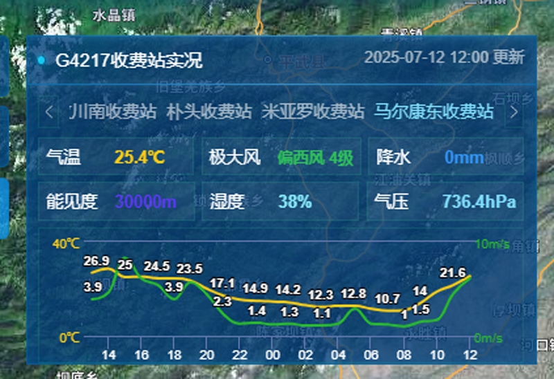 平台对沿线气象状况进行实时监测+动态更新——从普通路段到地质灾害隐患点(如泥石流沟、滑坡区),每一处的气温、降水、风力、能见度变化都能被精准捕捉,彻底告别信息盲区。
