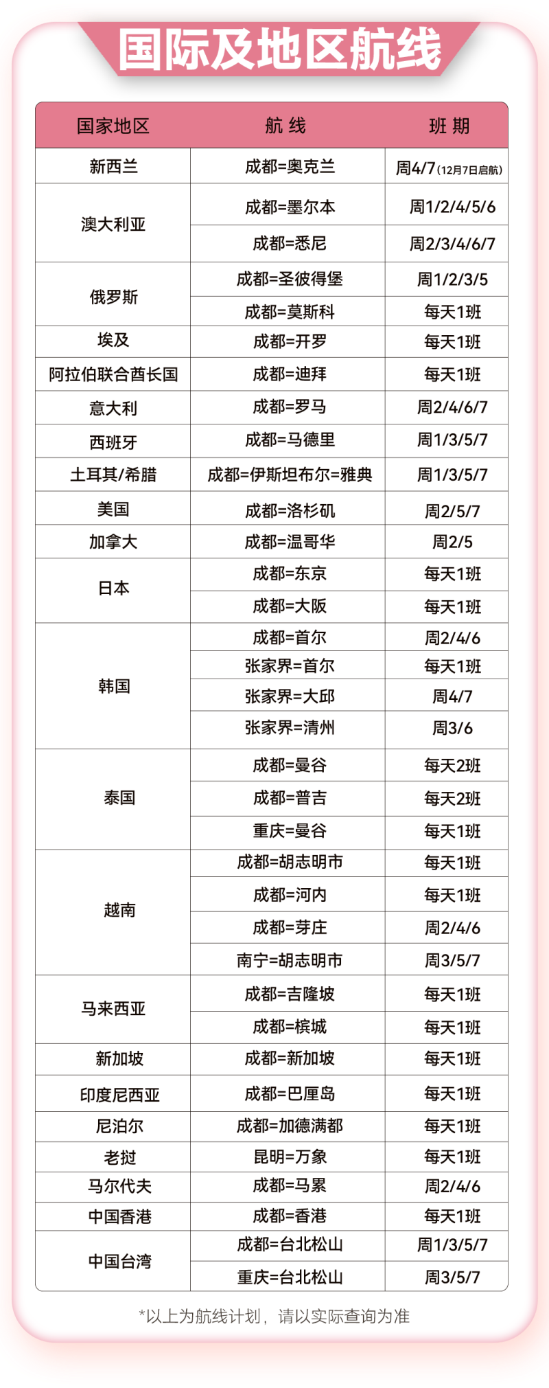 川航国际及地区航班计划也已出炉,将执飞32条国际航线和3条港台地区航线。其中,成都=奥克兰直飞航线计划于12月7日恢复。