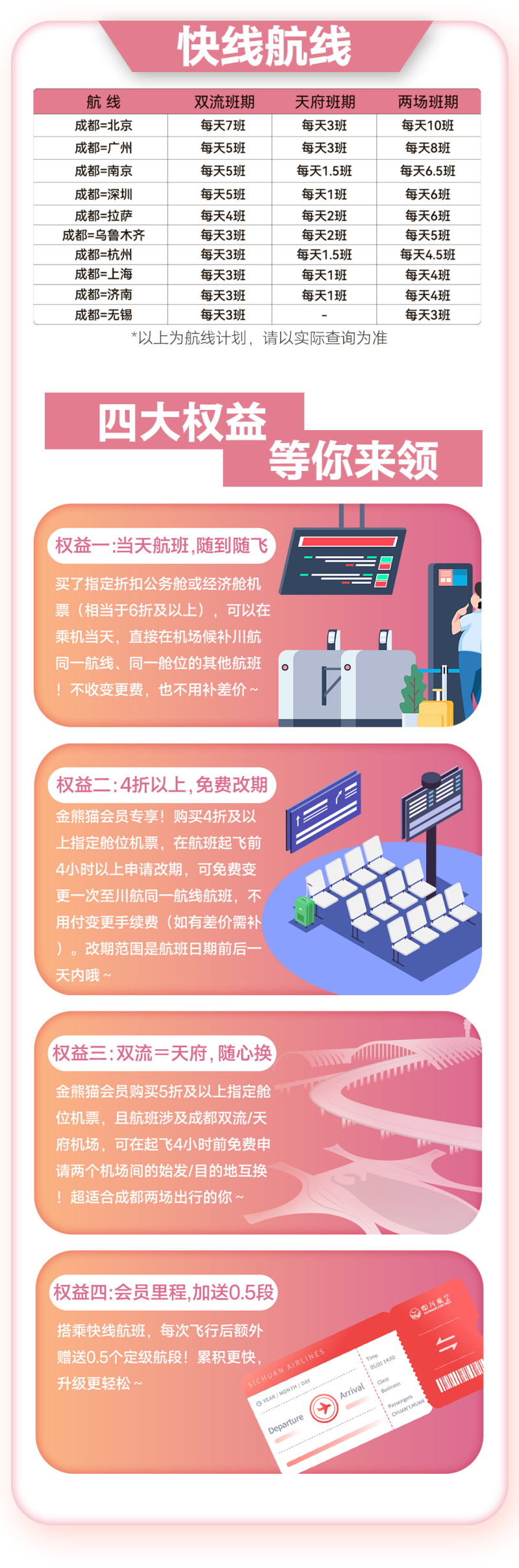旅客搭乘川航出行,可享多重权益。例如,购买指定折扣公务舱或经济舱机票(相当于6折及以上),可在乘机当天在机场候补川航同一航线、同一舱位的其他航班,不收取变更费,也无需补差价;川航金熊猫会员购买4折及以上指定舱位机票,在航班起飞前4小时以上申请改期,可免费变更一次至川航同一航线航班,不用付变更手续费(如有差价需补),改期范围为航班日期前后一天内;金熊猫会员购买5折及以上指定舱位机票,且航班涉及成都双流/天府机场,可在起飞4小时前免费申请两个机场间的始发/目的地互换。