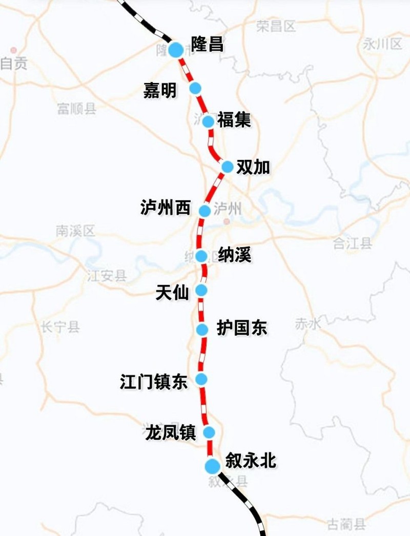 隆泸叙铁路由蜀道铁路投资集团主导投资,线路自成渝铁路隆昌站引出,途经泸县、龙马潭区、江阳区、纳溪区、叙永县,终至叙毕铁路叙永北站。线路全长约138.6公里,按国铁Ⅰ级单线标准建设,客货共线以货运为主,设计时速120公里,共设隆昌、嘉明、福集、双加、泸州西、纳溪、天仙、护国东、江门镇东、龙凤镇、叙永北11座车站。