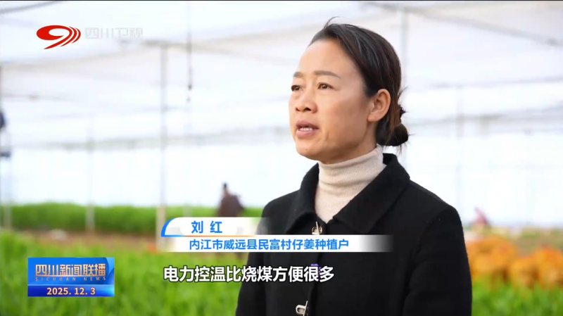 内江市威远县民富村仔姜种植户 刘红:电力控温比烧煤方便很多,我在控制器上按两下就能设定理想温度。我一个人就能精准控制两三亩姜田的温度。