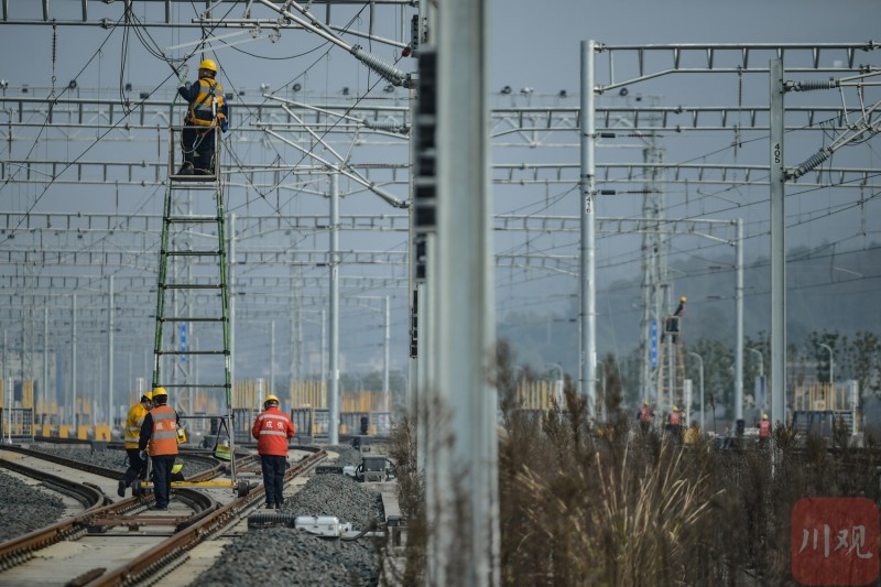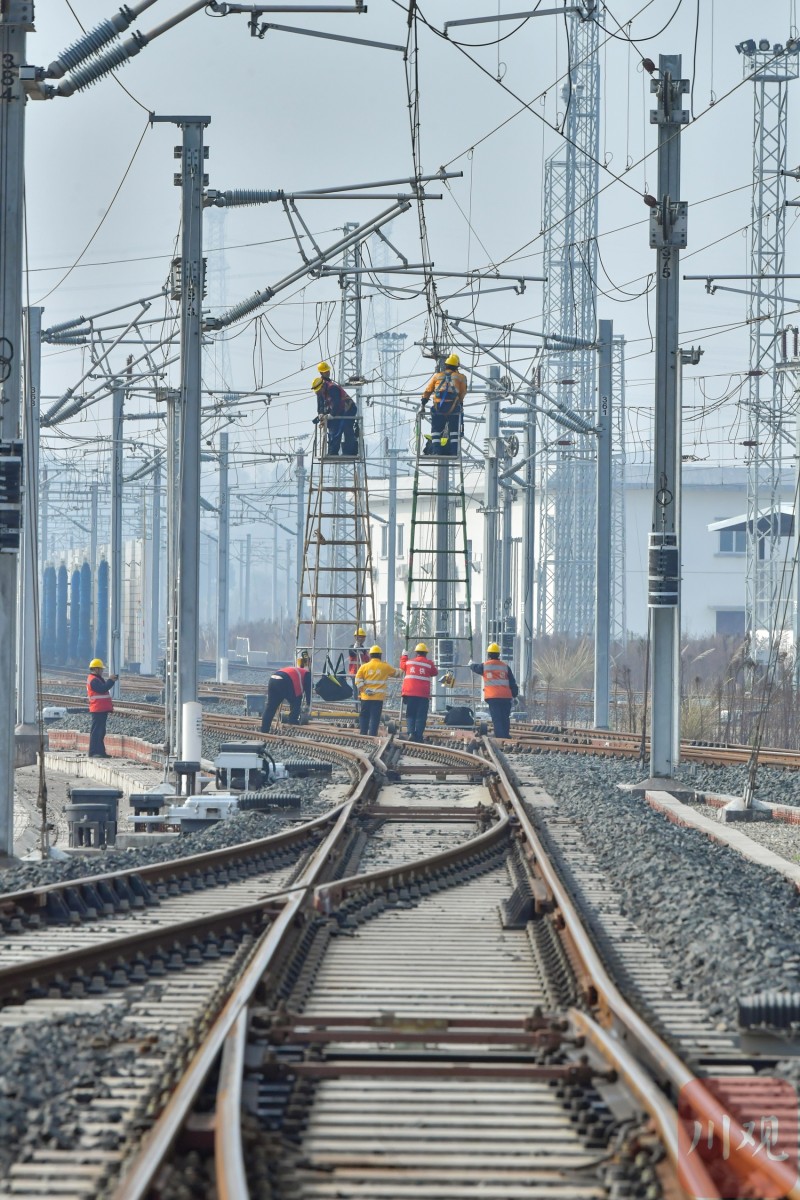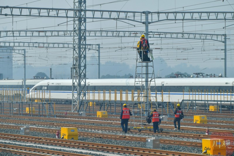 1月13日,中国铁路成都局集团有限公司成都供电段组织职工在天府动车所开展接触网设备集中检修,全力确保供电设备运行稳定。