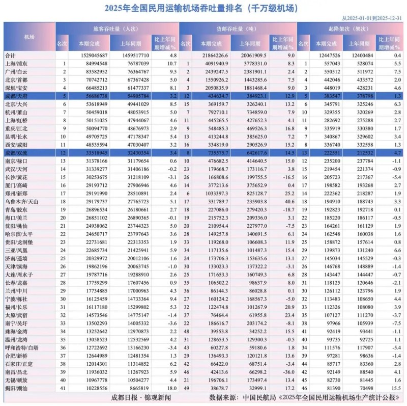 2025年,成都天府机场以5669万人次的旅客吞吐量,排名第五位,同比增长3.2%;成都双流机场旅客吞吐量为3352万人次,排名第十二位,同比增长3.4%。成都两个机场旅客吞吐量排名均与2024年保持一致。